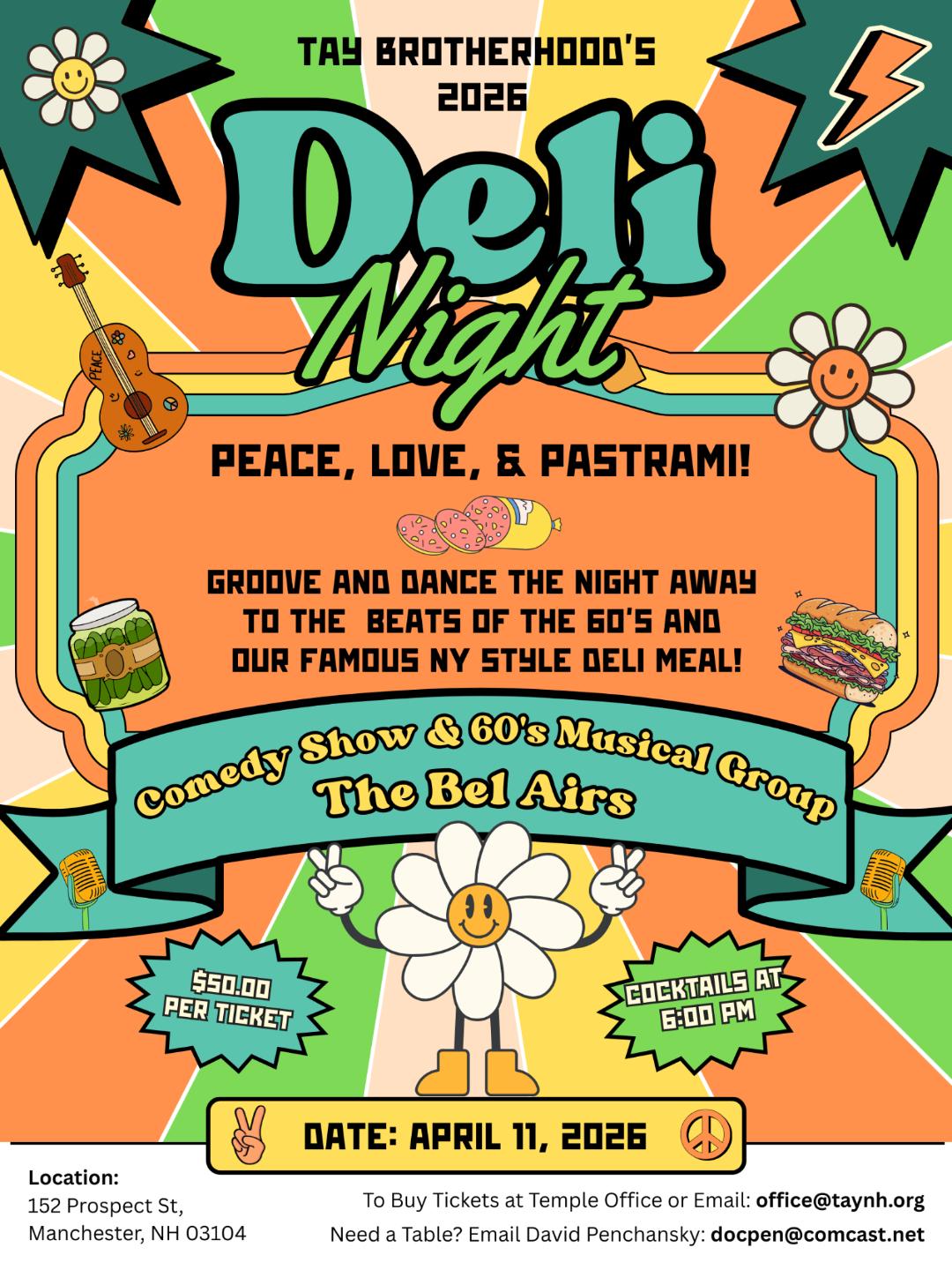 â–¶ Apr 11 (Saturday) Deli Night, Temple Adath Yeshurun, Prospect St, Manchester, NH, 6pm (ticket info)